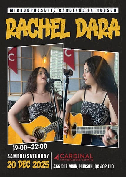 Celebrate the winter holidays and New Years with Rachel Dara at Microbrasserie Cardinal in Hudson on Saturday, December 20th 2025 from 7pm-10pm! No cover charge, everyone of all ages is welcome!