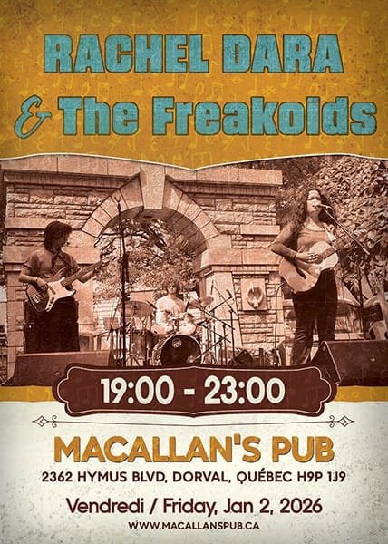 Rachel Dara & The Freakoids will be playing Friday January 2nd, 2026 at Macallan’s Pub in Dorval from 7-11pm.
